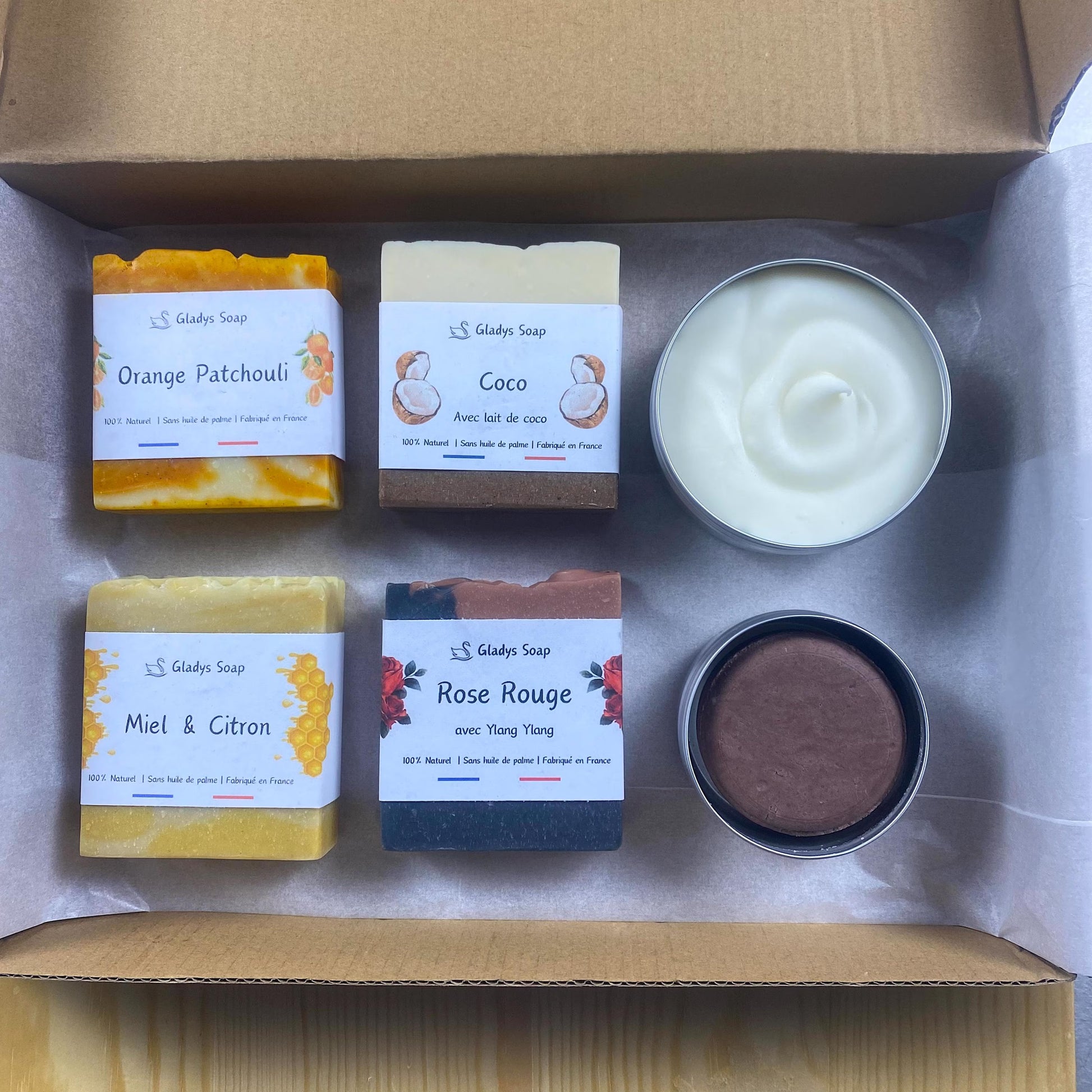 Seifenbox-Set: 4 Seifenstücke + Körperbutter + festes Shampoo